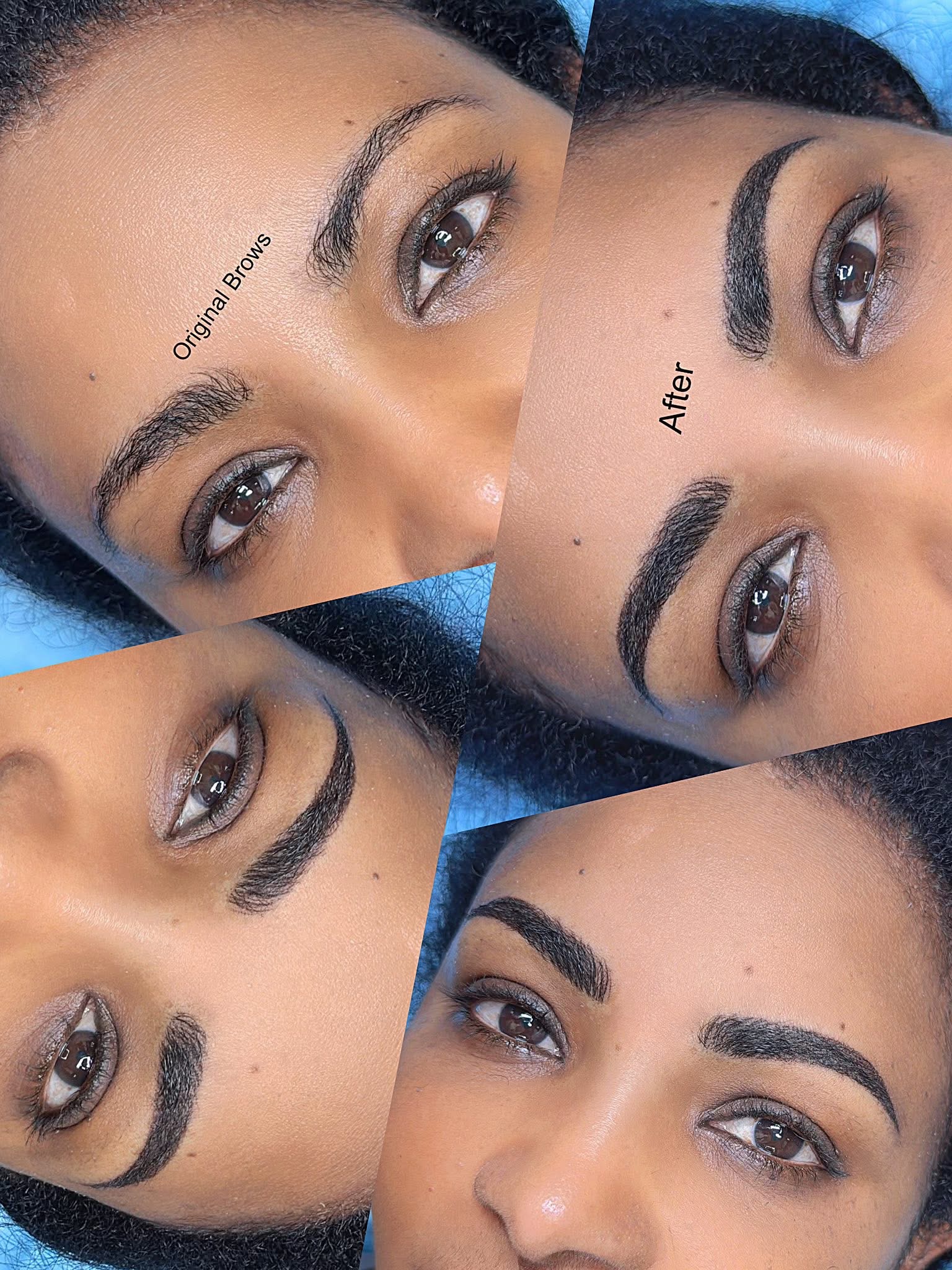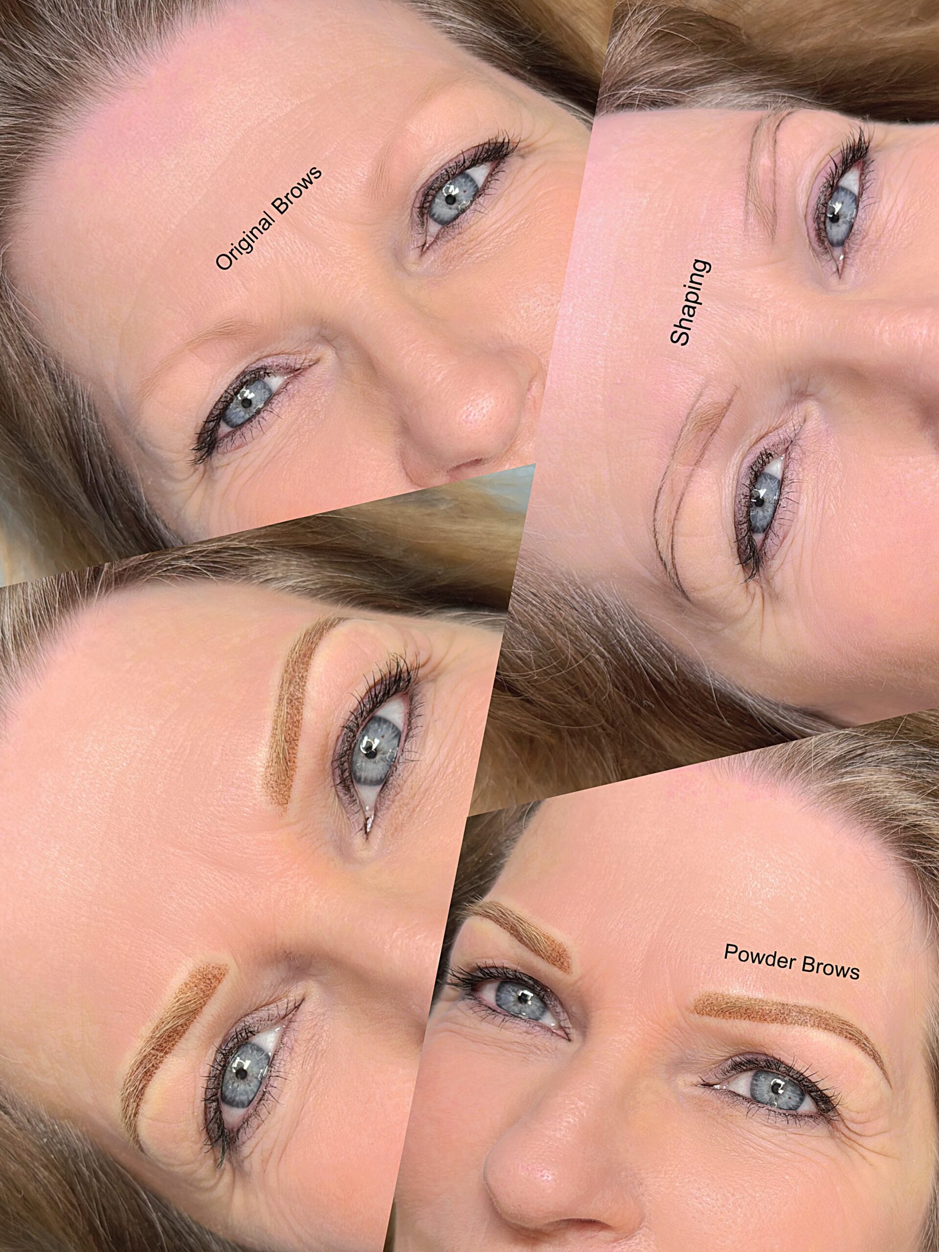 Sparse natural brows can look uneven with makeup. Powder brows eliminate that completely. - Face-framing transformation